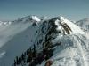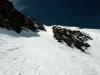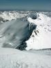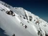 The American Fork Twins tower over the Gad Valley at Snowbird, Utah. There's a ridge between the East Twin (11,443 ft.) and the taller West Twin (11,489 ft.). Dropping off the top of the West Twin is Pipeline, a long chute that empties out at Pipeline Bowl in the Little Cloud area of Snowbird; it's perhaps 1000 vertical feet. The red arrow in the photo at the right points to the chute. Click here for a description and photos of hiking the Twins in the summer, and here for a report on snowboarding down Pipeline.